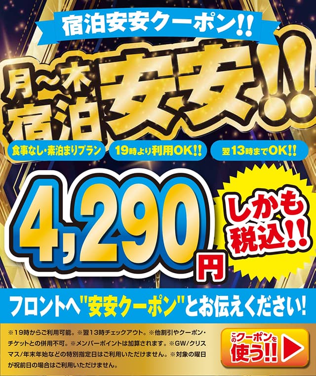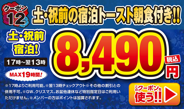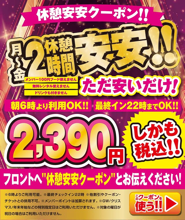 ご入室前にフロントまでクーポン番号・内容をお伝え下さい。